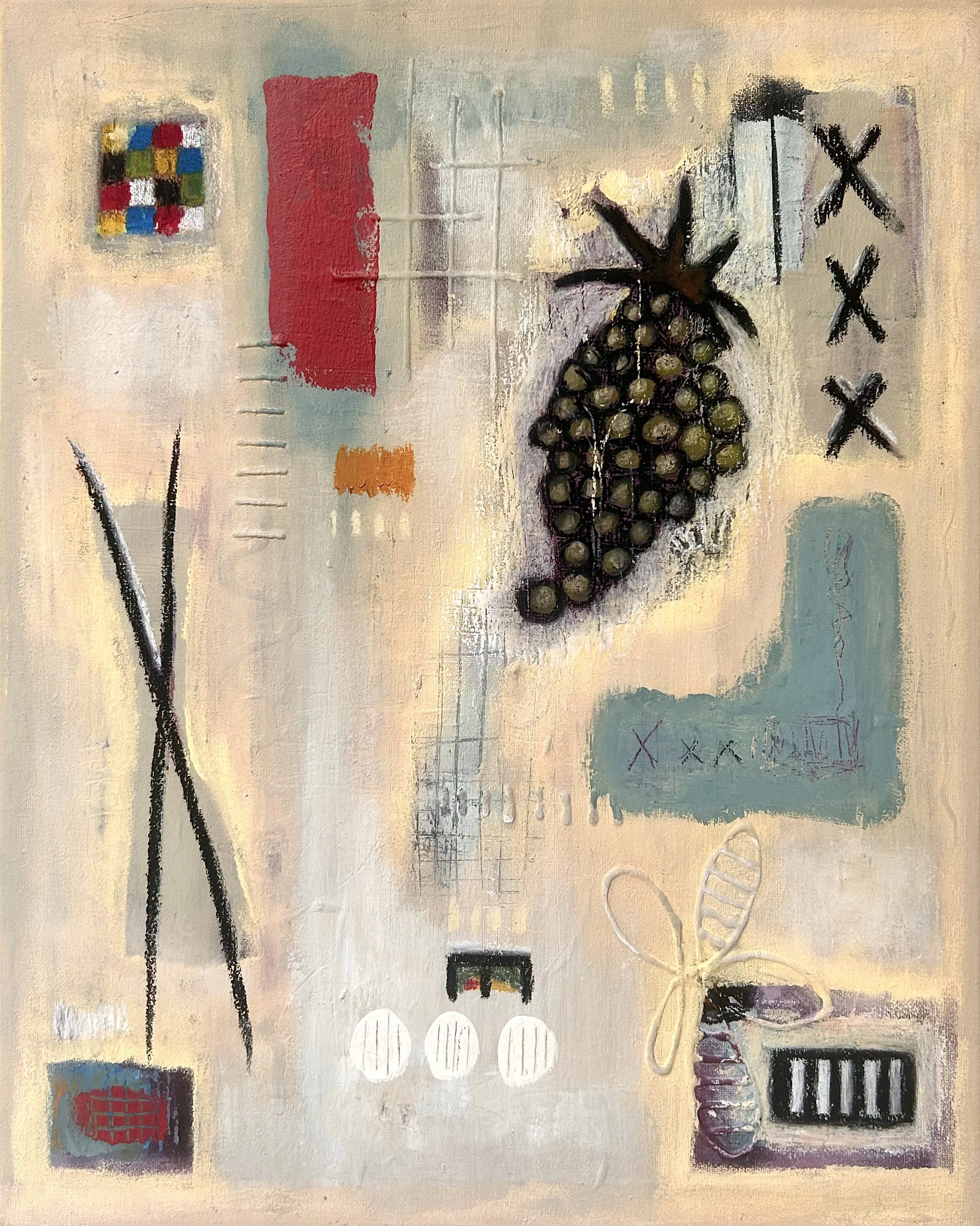 COMPTINE Size50 x 40 cm (framed in white handmade bars) MediumsMixed media: acrylic, oil pastels, wall paint and charcoals. Painted on a stretched cotton canvas.Year2024 Description & InspirationMade you look.
