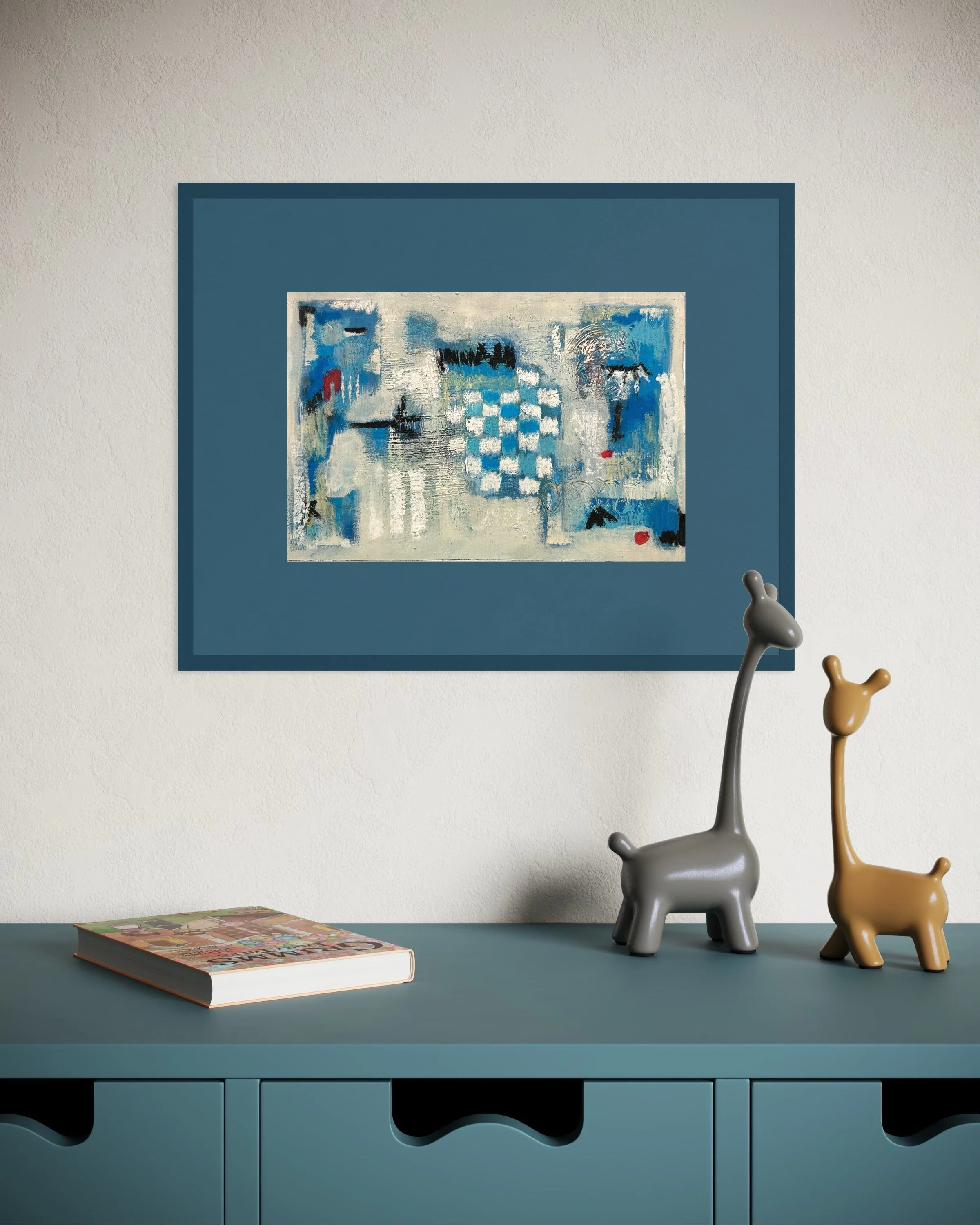 Mixed media: acrylics, wall paint, charcoal, oil pastels & soft pastels. Painted on a Canson sheet. Comes framed and mounted as per buyer preference.