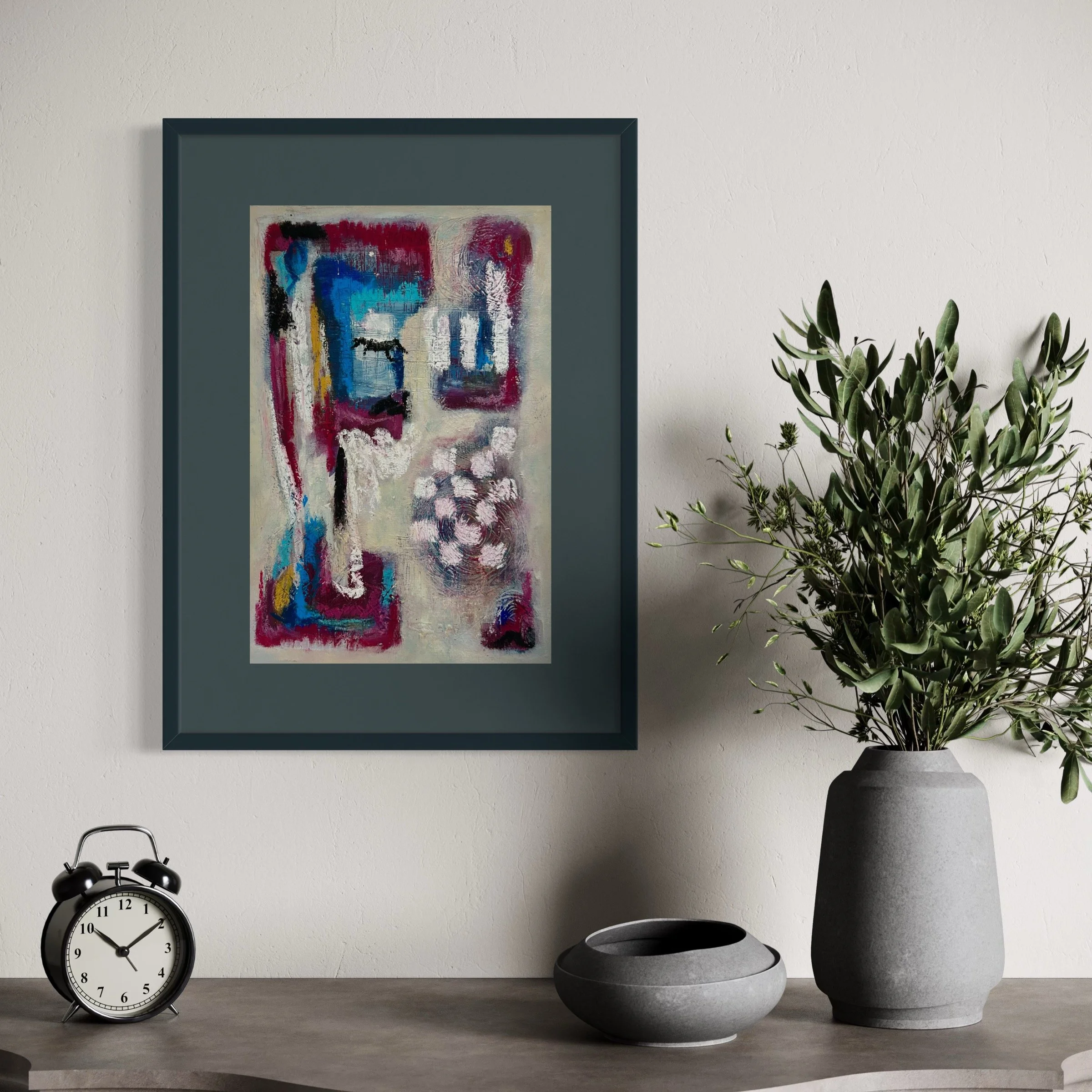 Mixed media: acrylics, wall paint, charcoal, oil pastels & soft pastels. Painted on a Canson sheet. Comes framed and mounted as per buyer preference.